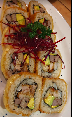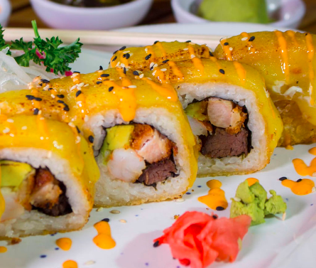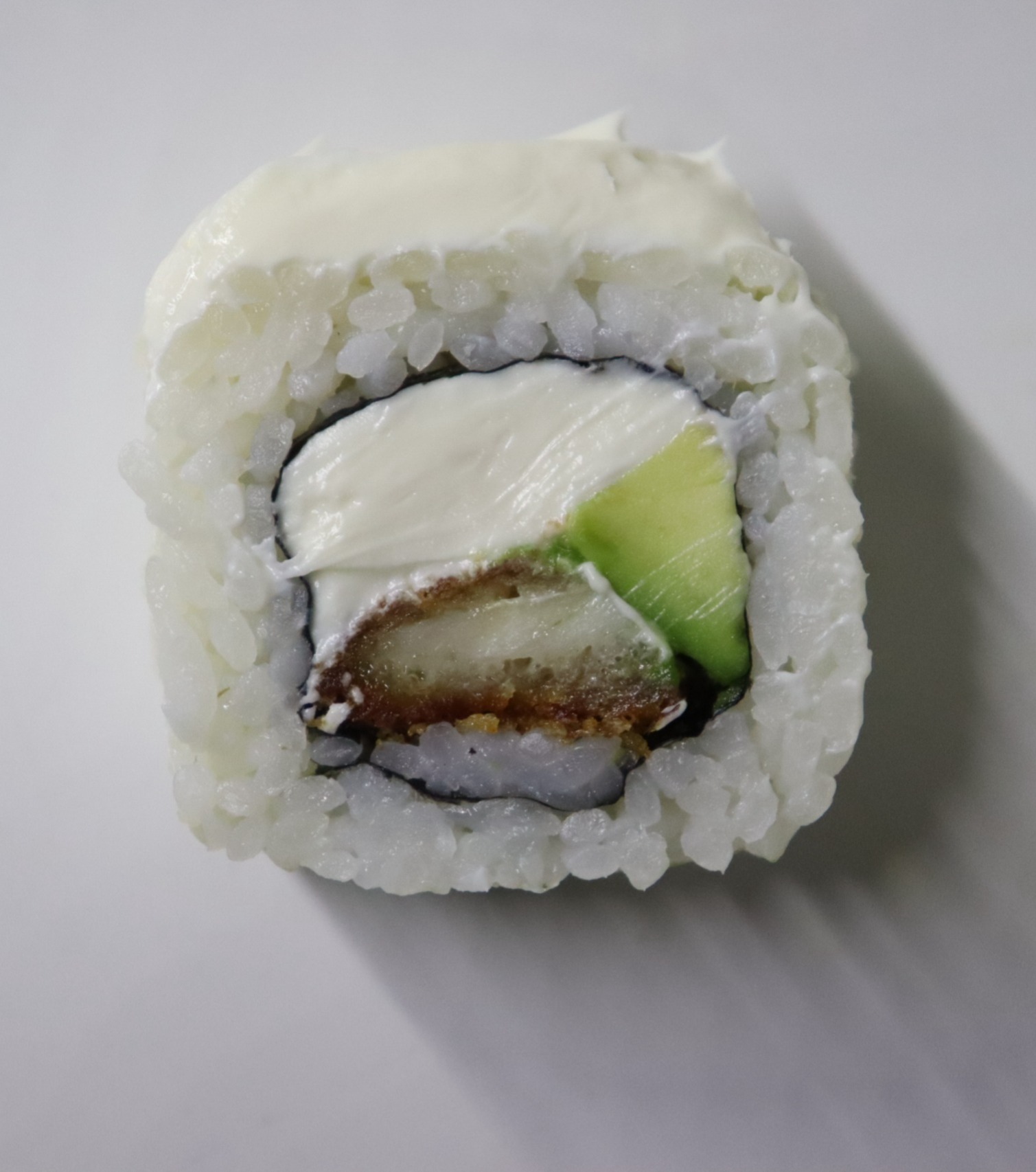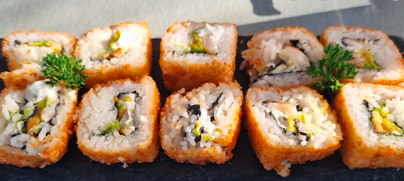 PD: queso crema, agaucate y pepino. PF: camarón, tempura y salsa spicy.