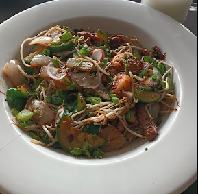 Pulpo frito, pasta de cilantro, tomate verde y rojo, cerdo, cebollín, poro, germen de soya, huevo y furikake.
