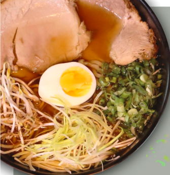 4 Camarones al mojo de ajo, cerdo, cebollín, poro, moyashi, huevo y furikake.