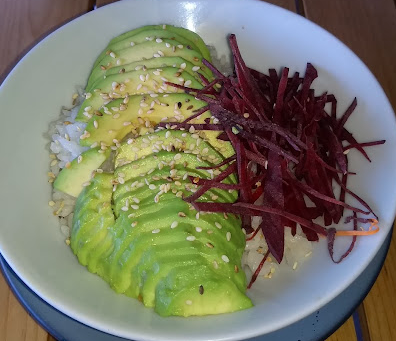 Atún, aguacate, atún picante servido sobre arroz al vapor.