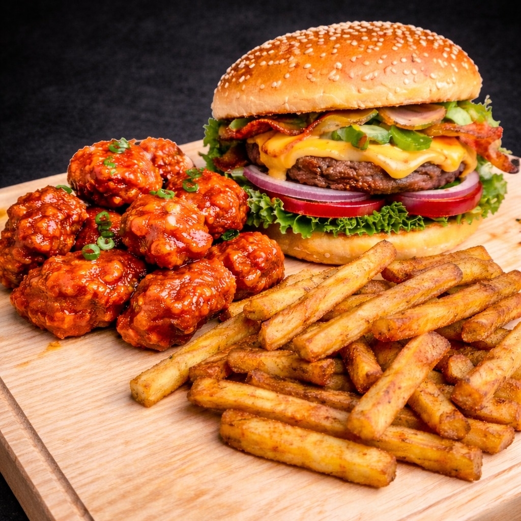 El combo perfecto para los que no se quedan con hambre. Disfruta una hamburguesa a la parrilla de 125 g, jugosa y bien dorada, servida en pan suave, con queso derretido, tocino crujiente, vegetales frescos y aderezos de la casa. Acompañada de 5 boneless crujientes, bañados en tu salsa favorita, y una porción generosa de papas doradas, recién hechas y sazonadas.