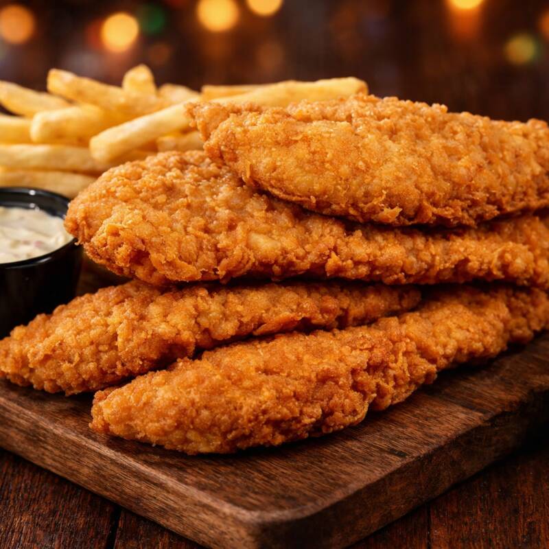 12 tenders dorados y jugosos, empanizados al momento para máxima textura, con papas recién hechas y nuestro dip especial exclusivo.