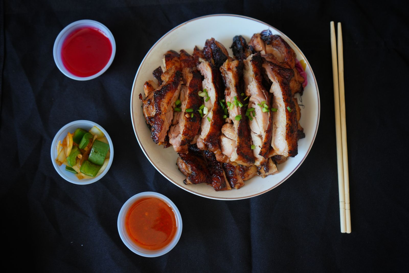 Pollo asado lentamente para conservar su jugosidad, acompañado de especias tradicionales.