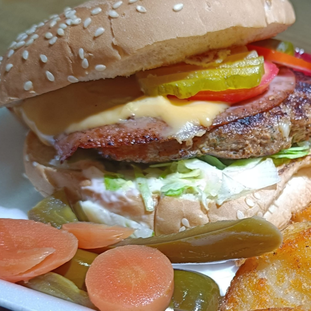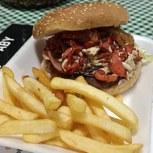 carne casera 100%,tomate,cebolla,romanita,jamon,queso tipo americano,pepinillos y aderezos (incluye papa a la francesa)