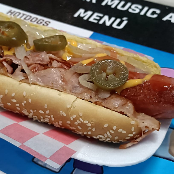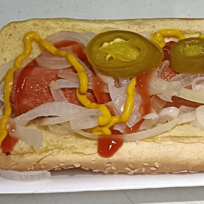 salchicha jumbo,cebolla y derezos