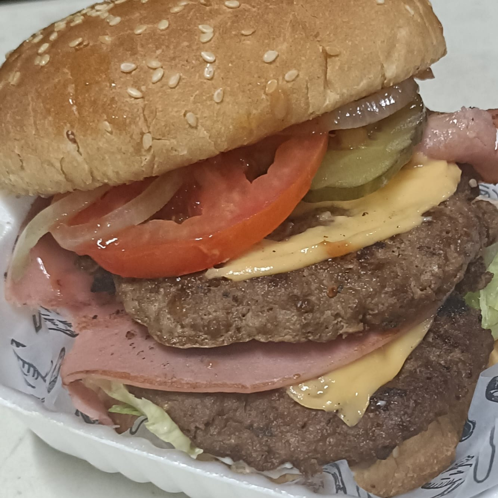 Doble carne casera,jamon x2,quesod tipo americano x2,pepinillos,tomate,cebolla,romanita y aderezos(incluye papas a la francesa)