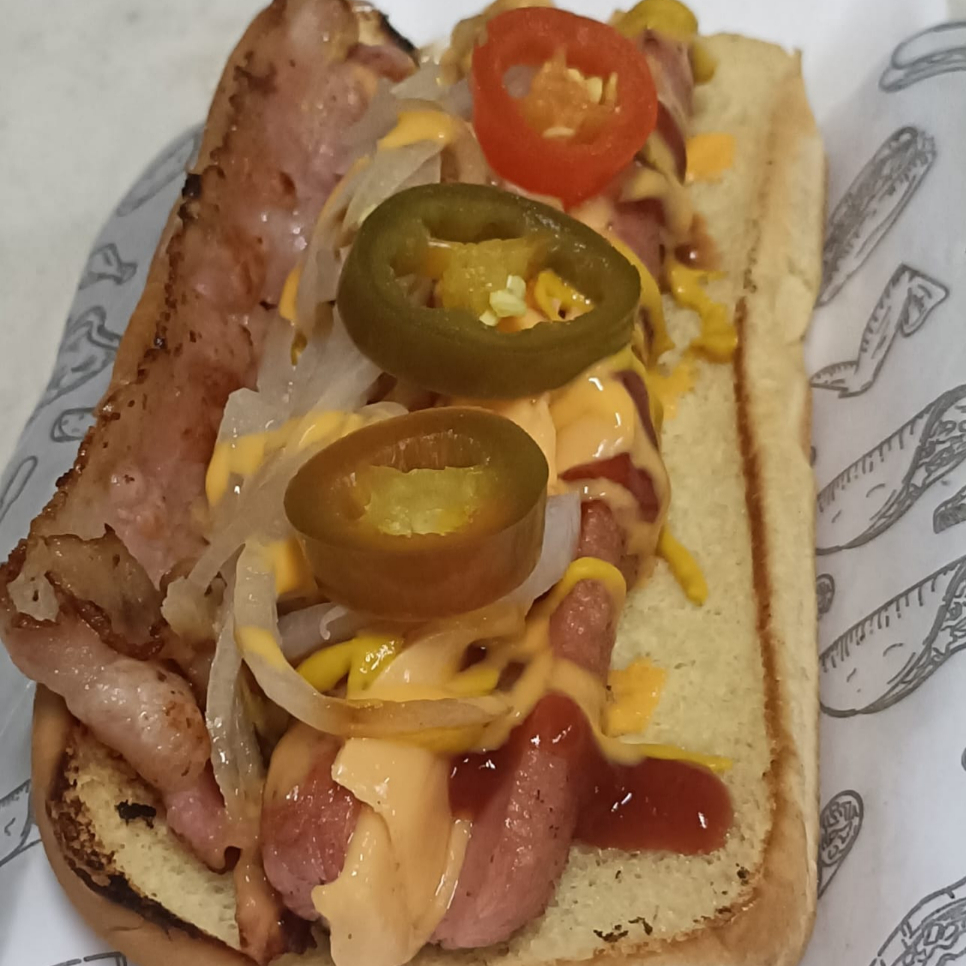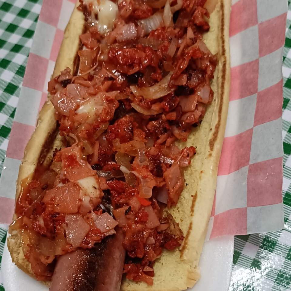 salchicha roja,tocino,queso tipo americano,queso derretido,cebolla y chile de arbol