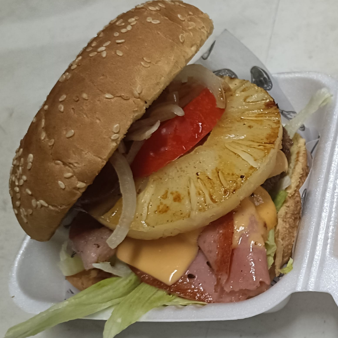 Carne casera,piña,tocino,jamon,queso tipo americano,tomate cebolla,pepinillo,romanita y aderezos(incluye papas a la francesa)