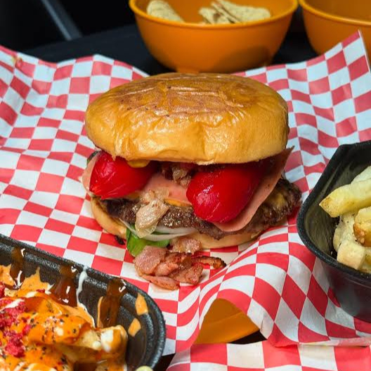 Hamburguesa con chorizo rojo , incluye pan brioche , carne de arrachera de doble carne c/u de 150 g , lechuga romanita , tómate, cebolla cocida , jamón, queso manchego , aderezos , catsup, mayonesa, mostaza y jalapeño.