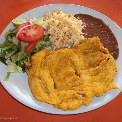 2 a 3 piezas de pechuga empanizada ( depende del tamaño ) , incluye arroz blanco , frijol kabax , un porción de tortillas amarillas , limón, romanita , tomate , cebolla y un habanero.