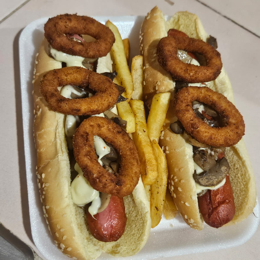 Dogo con chorizo rojo + 3 aros de cebolla y queso manchego gratinado, salchicha de pavo de 18 cm , pan dogo con ajonjolí de 18 cm , incluye cebolla cocida , aderezos catsup, mostaza, mayonesa, jalapeño y queso cheddar.