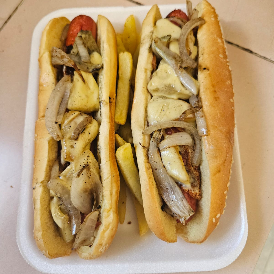 Rica carne de ARRACHERA DOBLE CARNE DE 150g c/u , con PAN BRIOCHE , acompañado de lechuga , tomate , cebolla , PIÑA , CHAMPIÑÓN, SALCHICHA DE ASAR, TOCINO y una porción de papa a la francesa con salsa de tomate , jamón y queso ,jalapeño aparte