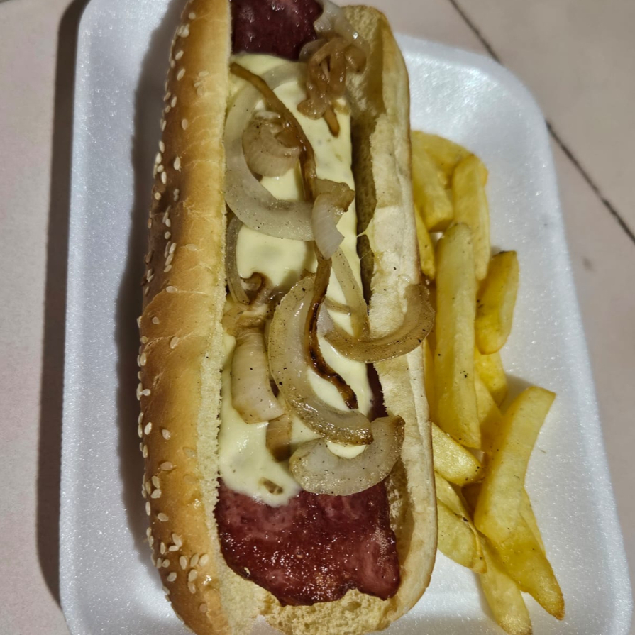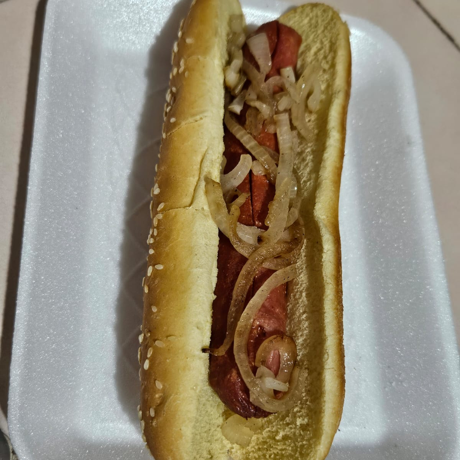 Dogo sencillo jumbo , con salchicha de pavo ( 18 cm ) pan de dogo con ajonjolí ( 19cm ), incluye aros de cebolla catsup , mostaza , jalapeño y mayonesa.