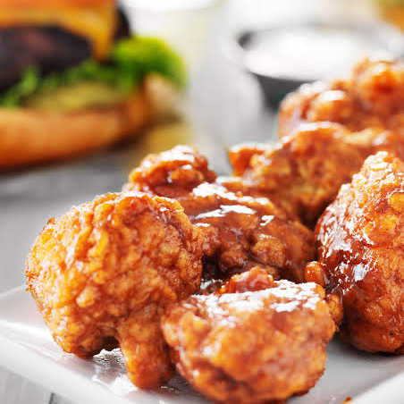 Bolitas de pechuga de pollo empanizada , fritas con salsa de PIÑA HABANERO , incluye aderezo ranch , NO INCLUYE ZANAHORIA Y APIO