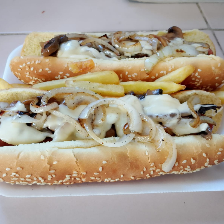 Dogo de salchicha de pavo jumbo ( 18 cm ) con champiñones , pan de dogo con ajonjolí ( 18 cm ) , incluye aderezos , aros de cebolla , mayonesa , mostaza , jalapeño ,catsup y una porción de papa francesa.