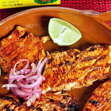 2 a 3 piezas de pechuga a la yucateca, bañada de achiote y cebolla cocida ( depende del tamaño ) , incluye arroz blanco , frijol kabax , un porción de tortillas amarillas , limón, romanita , tomate , cebolla y un habanero.
