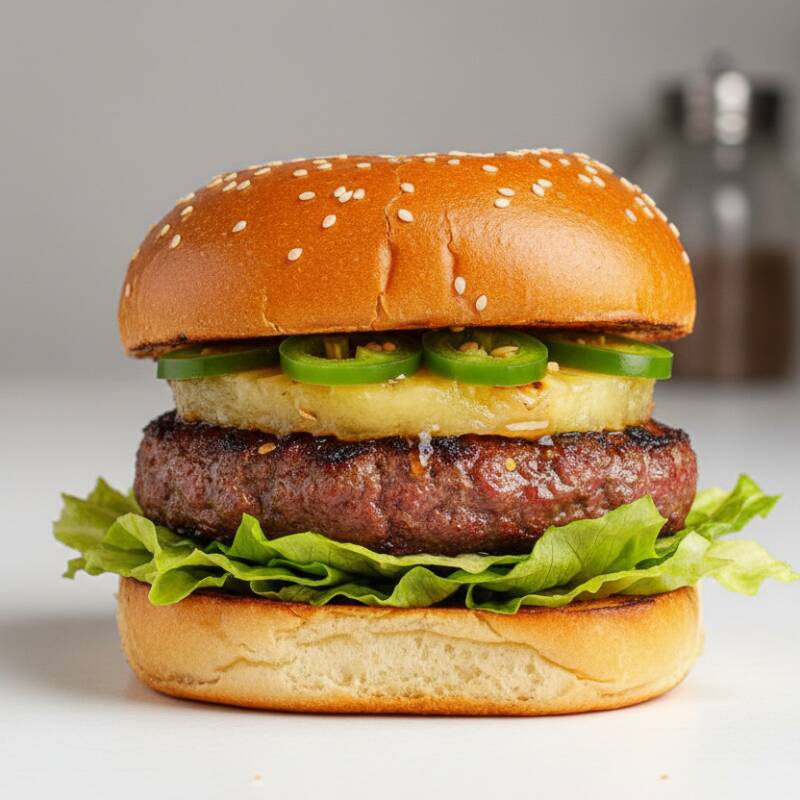 Carne a la parrilla bien jugosa coronada con piña asada dulce y rebanadas de jalapeño que despiertan el bocado. Cada mordida mezcla lo tropical con lo picante en un pan brioche suave, perfecta para quienes aman los contrastes que se quedan en la memoria.