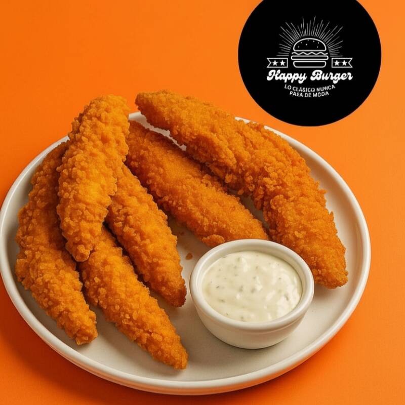 Grandes tiras de pollo empanizadas, doradas por fuera y suaves por dentro, listas para sumergirse en tu salsa favorita. Perfectos para compartir o para disfrutarlos solos con papas bien crujientes.