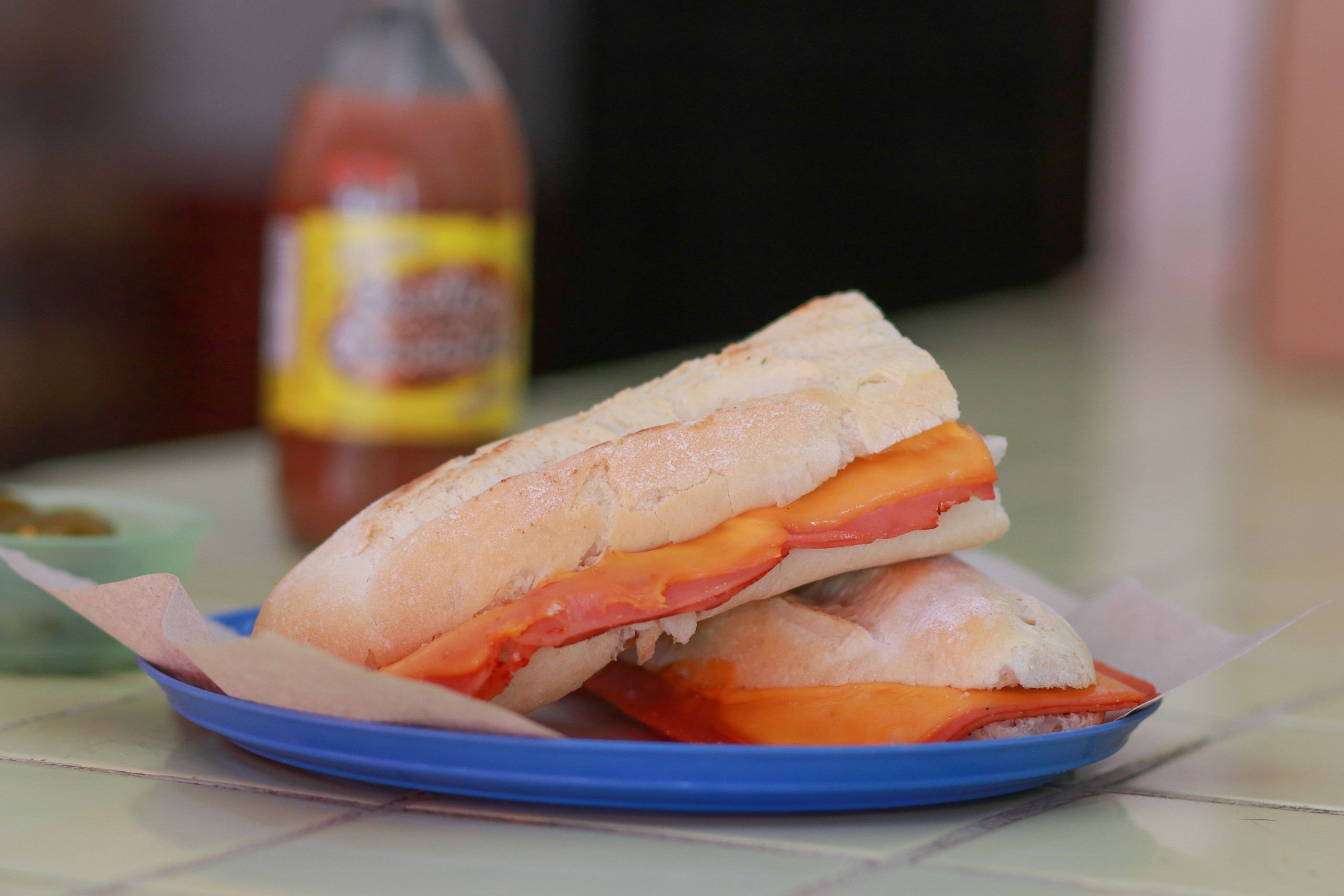 Media barra de pan francés ó bolillo yucateco con pastel pimiento, queso Daisy, mayonesa y jalapeños.