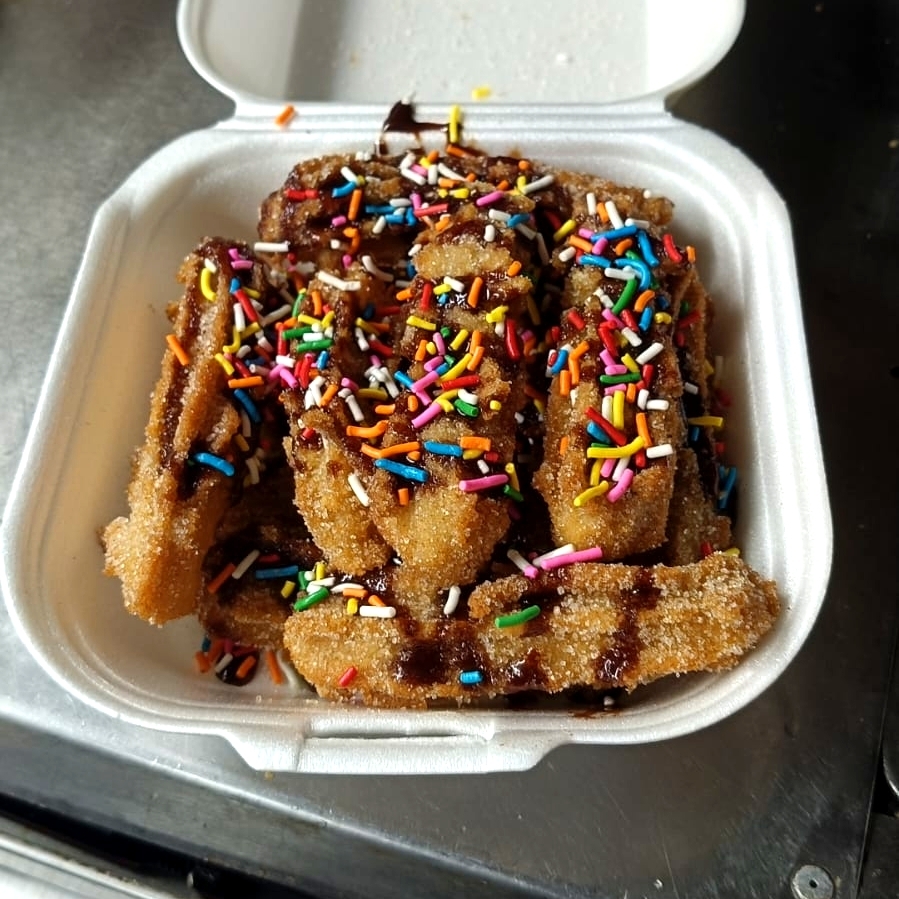 Deliciosos churros preparados con lechera o chocolate y chispas de colores