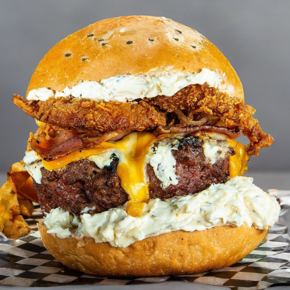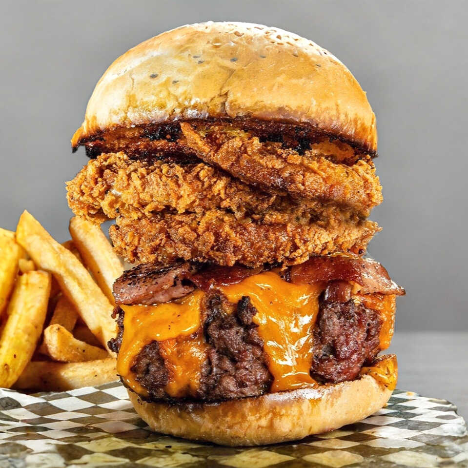 Hamburguesa con la proteína de tu elección, queso crema, americano, mozzarella, tocino y aros de cebolla, acompañada de papas a la francesa.