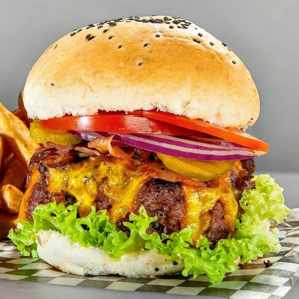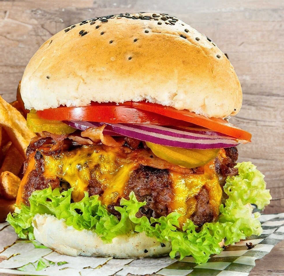 Hamburguesa con proteína, tocino, queso, lechuga, tomate y cebolla, acompañada de papas a la francesa.