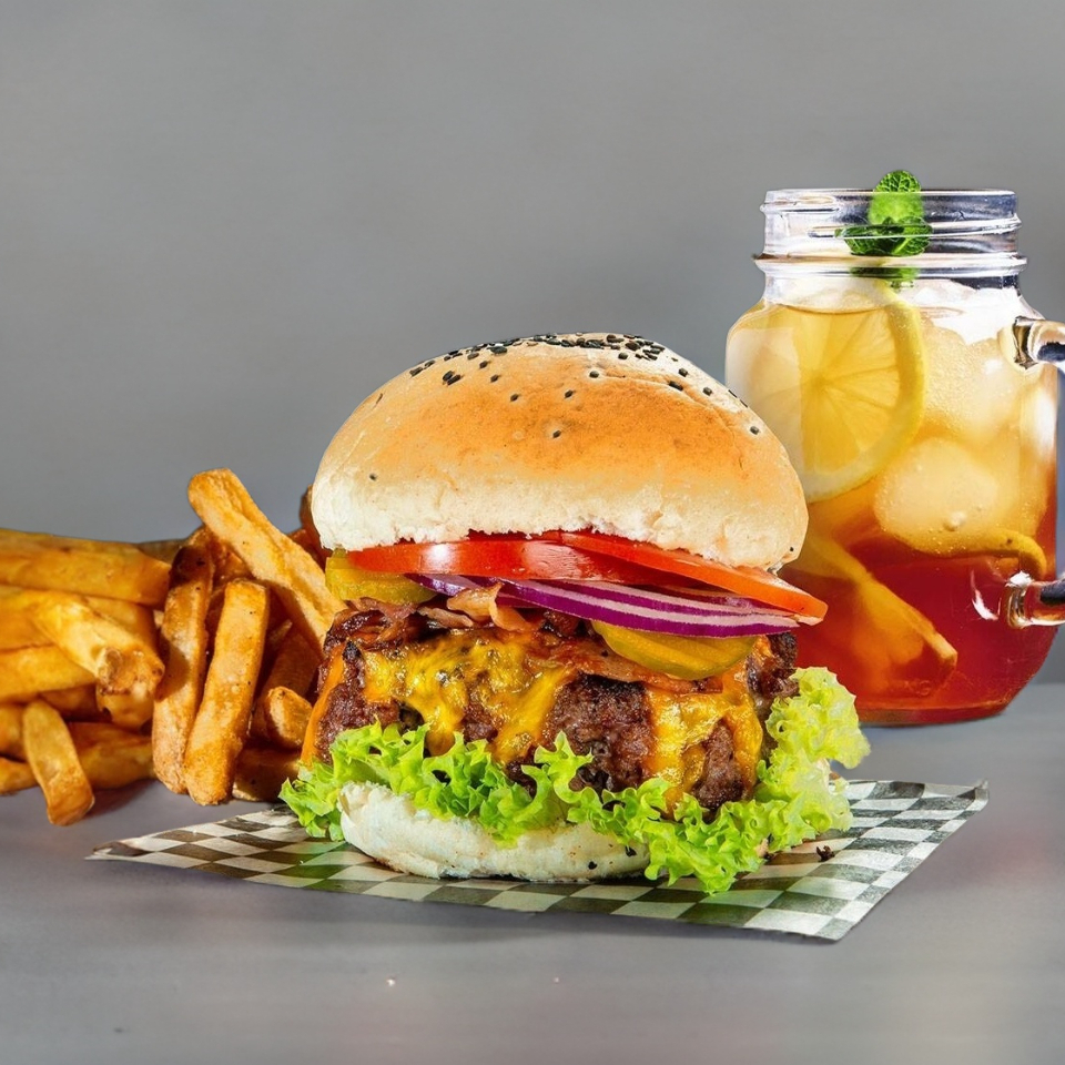 Hamburguesa con proteína, queso cheddar y mucho tocino, acompañada de papas a la francesa.