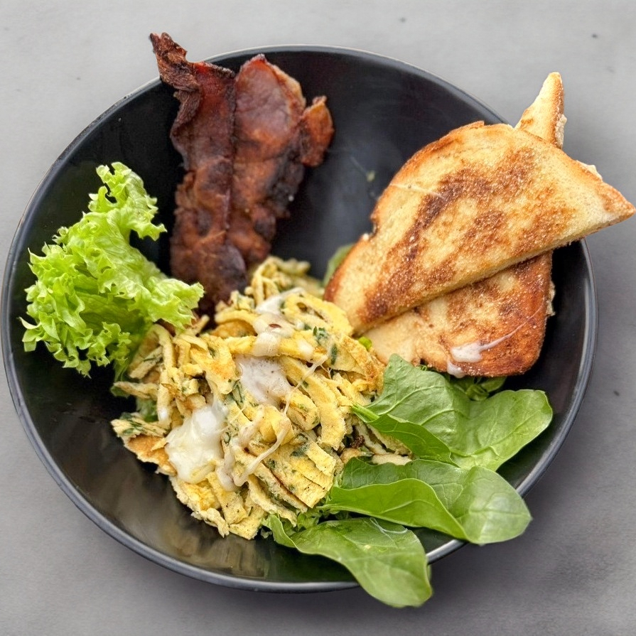 Huevos revueltos, espinaca, tocino, queso mozzarella acompañados de pan con ajo.