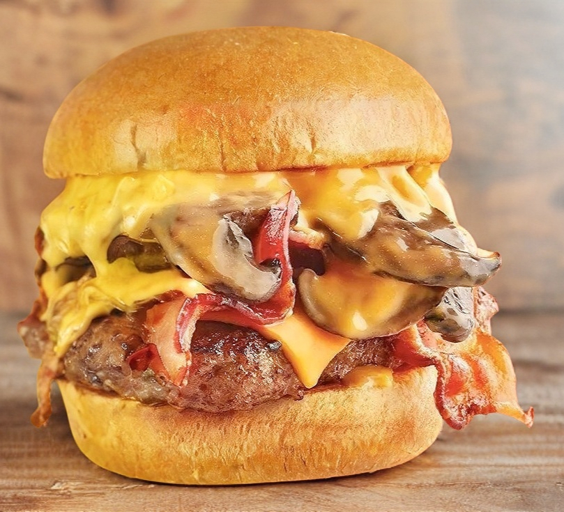 Hamburguesa de res con doble queso americano, y champiñones salteados con queso y parmesano, una combinación irresistible.