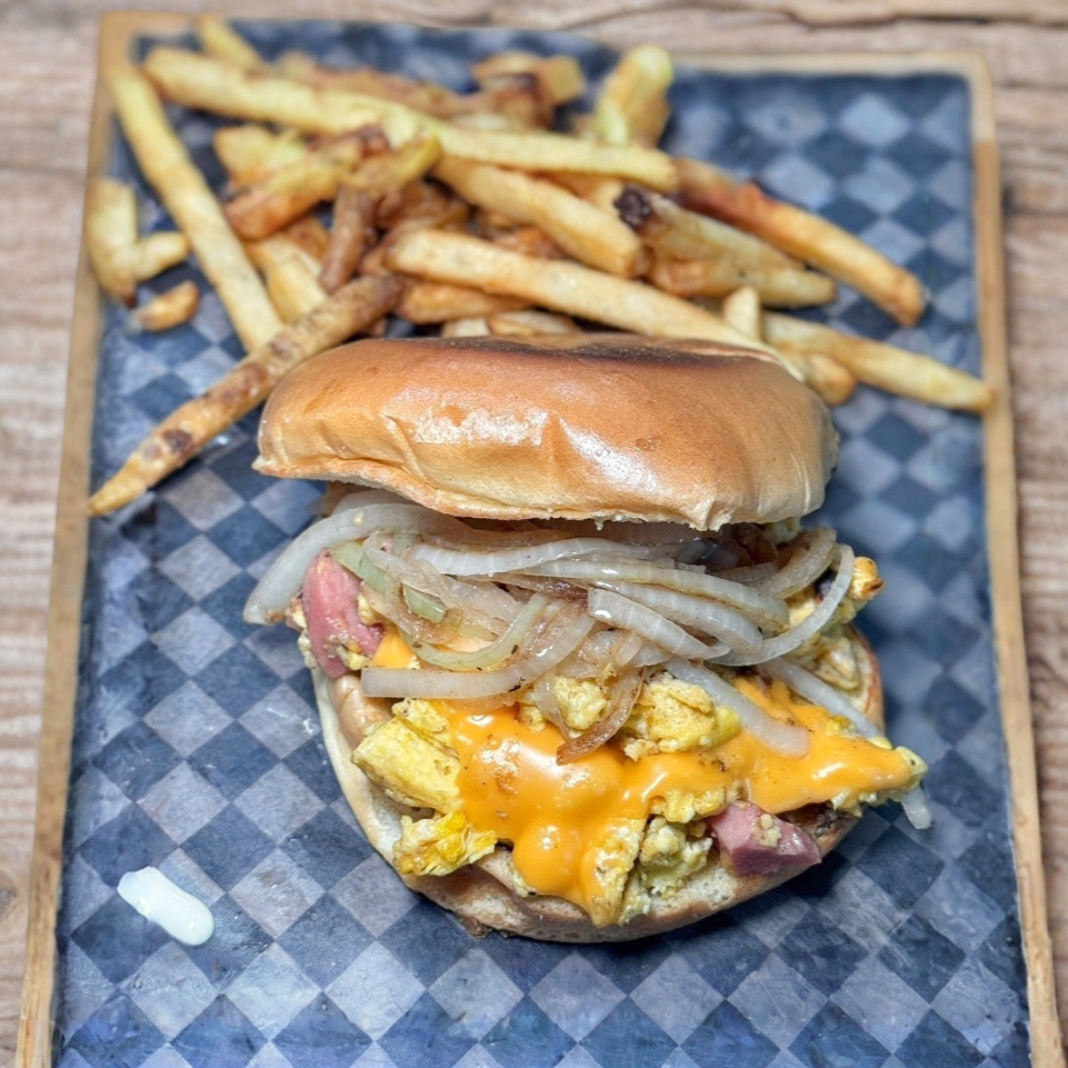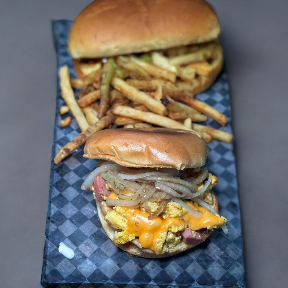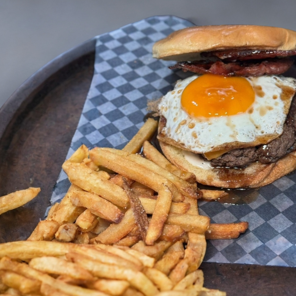 Pan brioche, carne de res, queso americano, tocino, queso estrellado y un huevo estrellado, acompañado de miel de maple y papas a la francesa