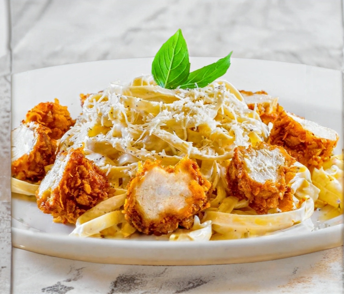 Fetuccini Alfredo cremoso con un toque de Blue Cheese y tiras de pollo empanizado.