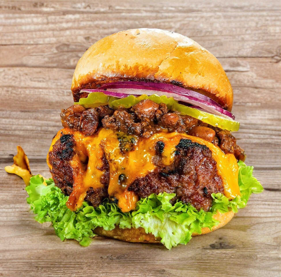 Hamburguesa con carne de res, lechuga, queso cheddar, pepinillos, cebolla y chilli, acompañada de papas a la francesa.