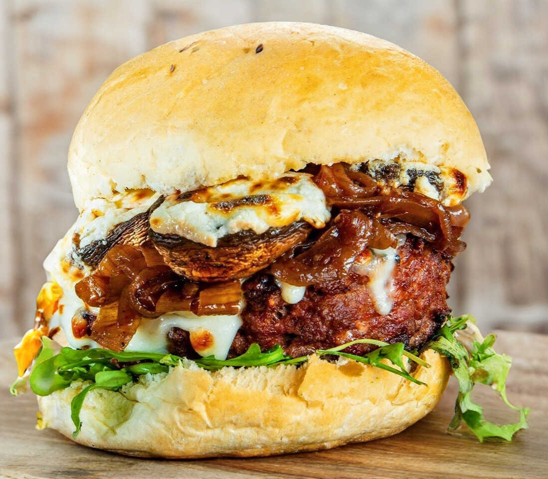 Hamburguesa con proteína, champiñones rellenos, cebolla caramelizada, queso y espinacas, acompañada de papas a la francesa.