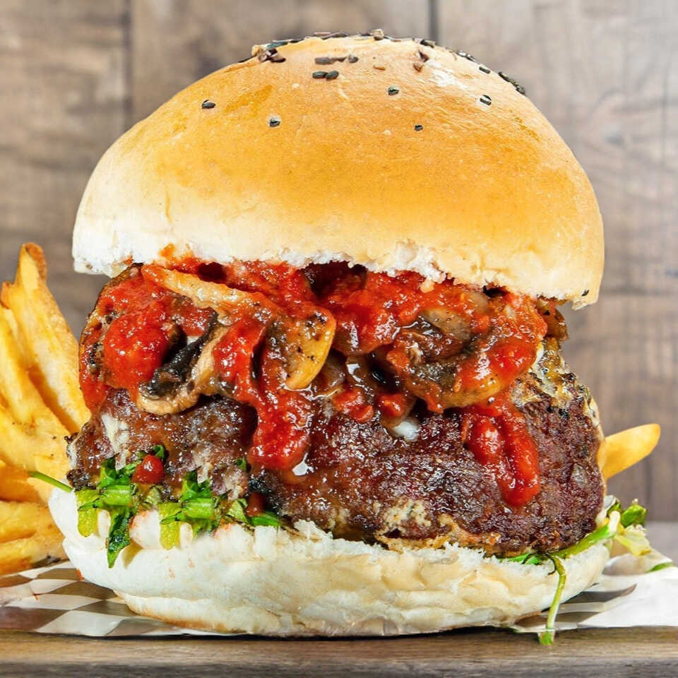 Hamburguesa con proteína, con salsa pomodoro, espinacas, queso mozzarella y champiñones, acompañada de papas a la francesa.