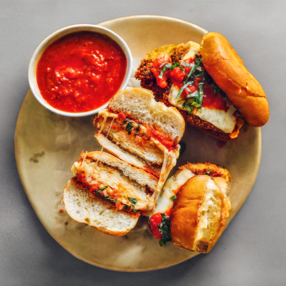 Pan brioche artesanal, pollo empanizado cubierto de mozzarella y parmesano, con espinacas y salsa marinara, acompañado de papas a la francesa.