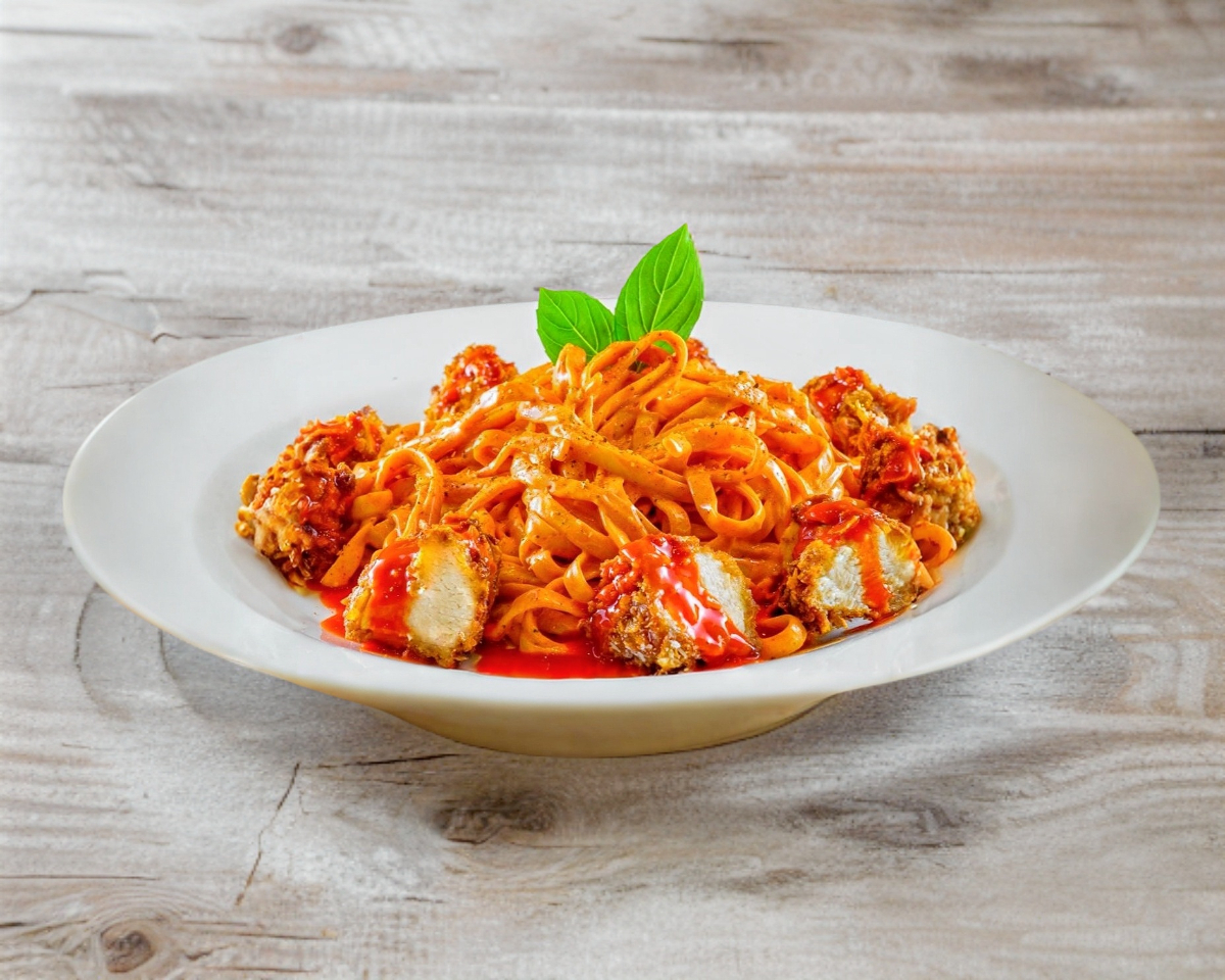 Fetuccini Alfredo cremoso con tiras de pollo empanizado búfalo