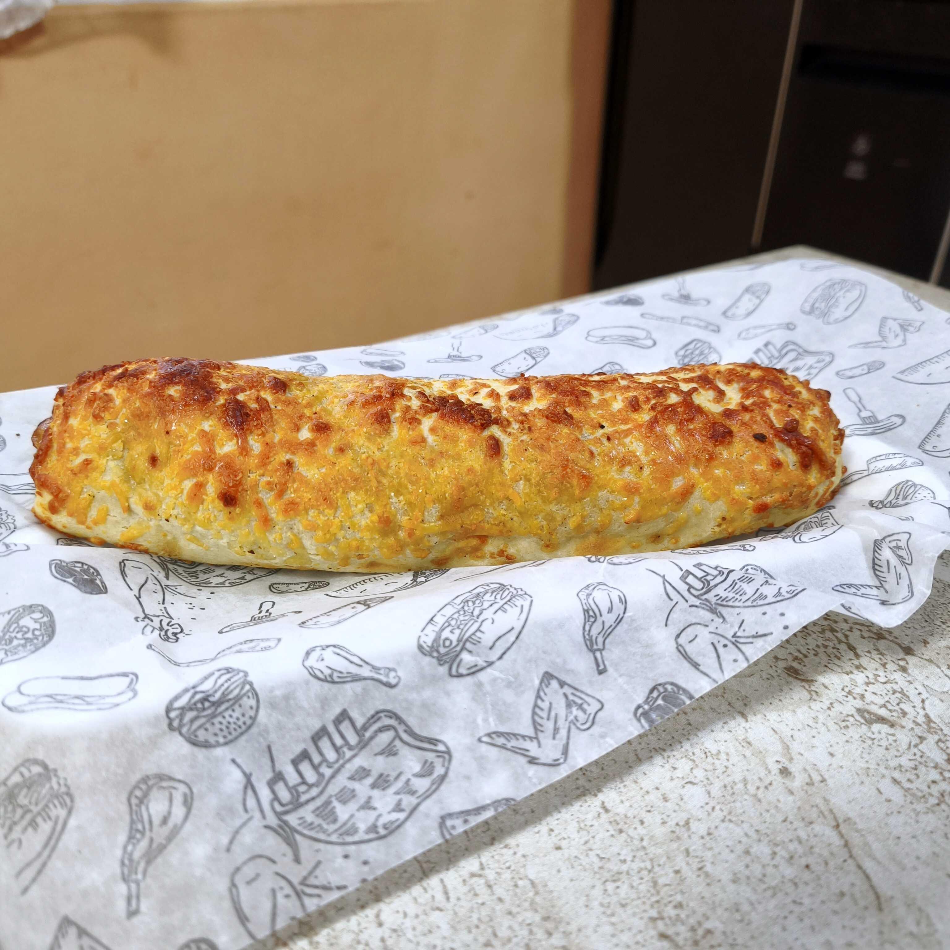 tiras de pechuga de pollo, una mezcla de quesos mozzarella, provolone y parmesano, tocino ahumado, aderezo César cremoso y cebollas verdes, todo envuelto en una masa de pan enrollada a mano