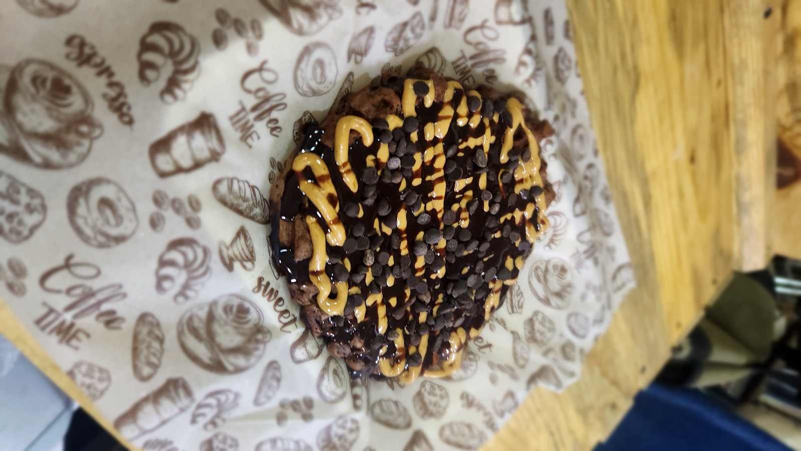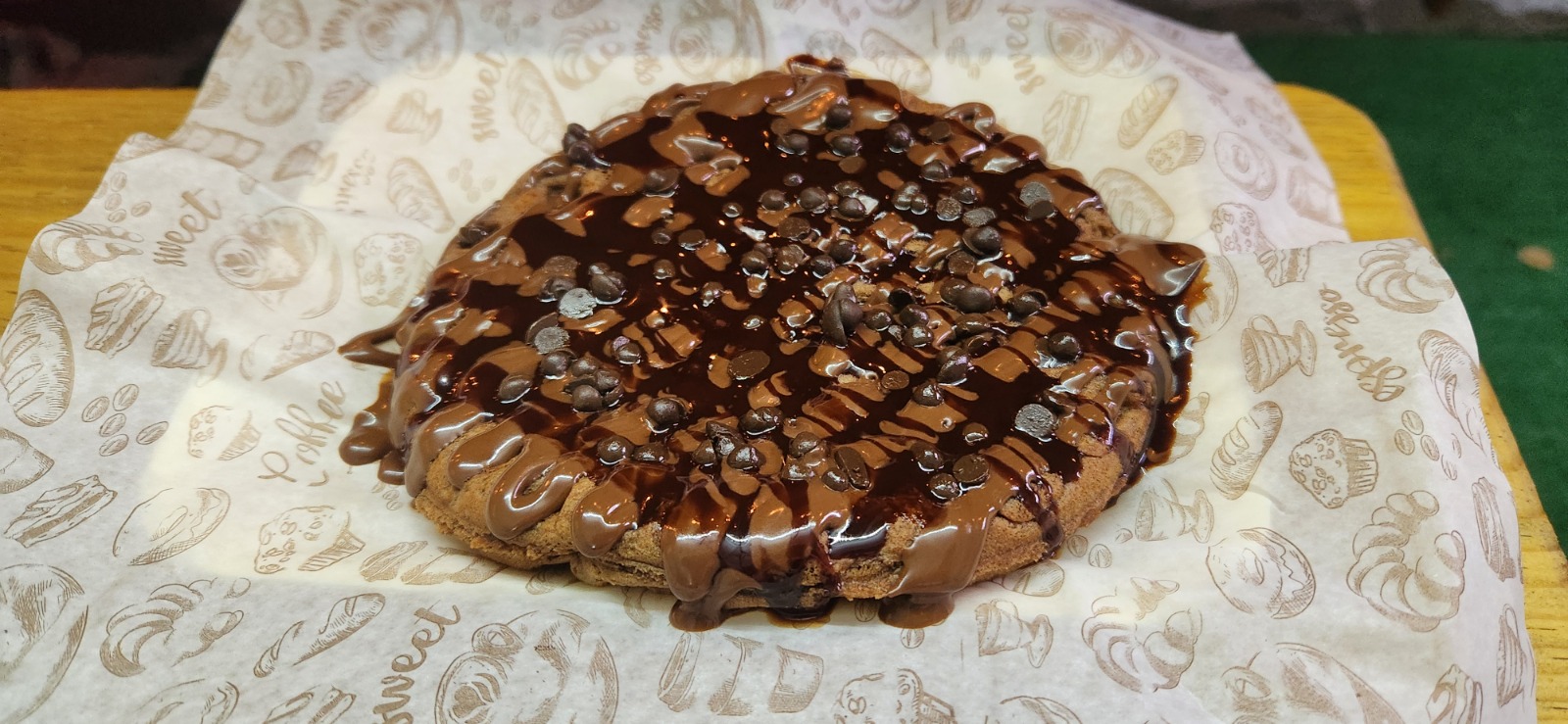 Apetitosa masa de chocolate, cubierta de crema de avellana, jarabe de chocolate y chispas de chocolate.