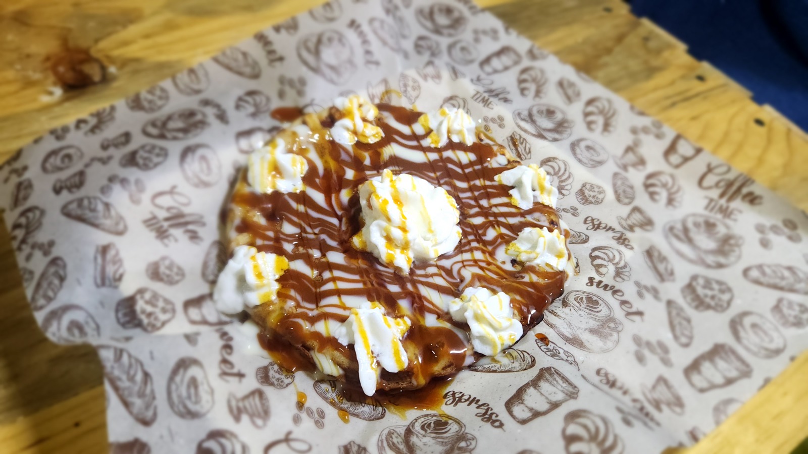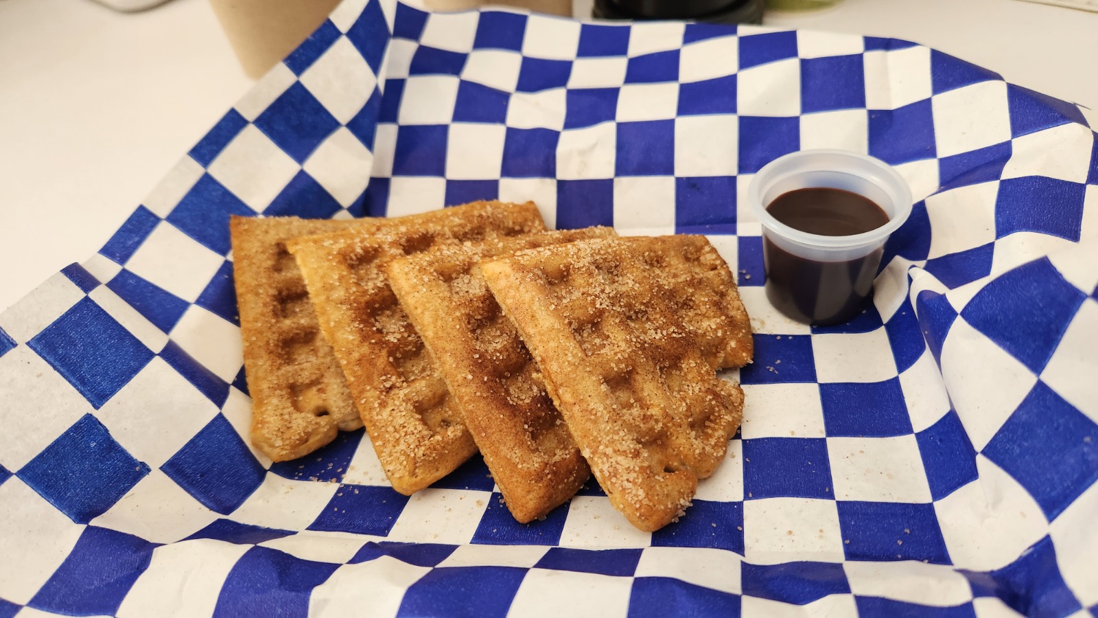 4 Piezas de Waffle, cubiertas de azucar y canela, incluye un topping adicional