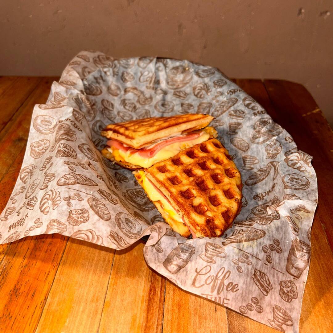 Sandwich elaborado con un Waffle, con Jamón de Pavo, Queso Gouda y Queso Crema, acompañado de un Latte de tu elección.
