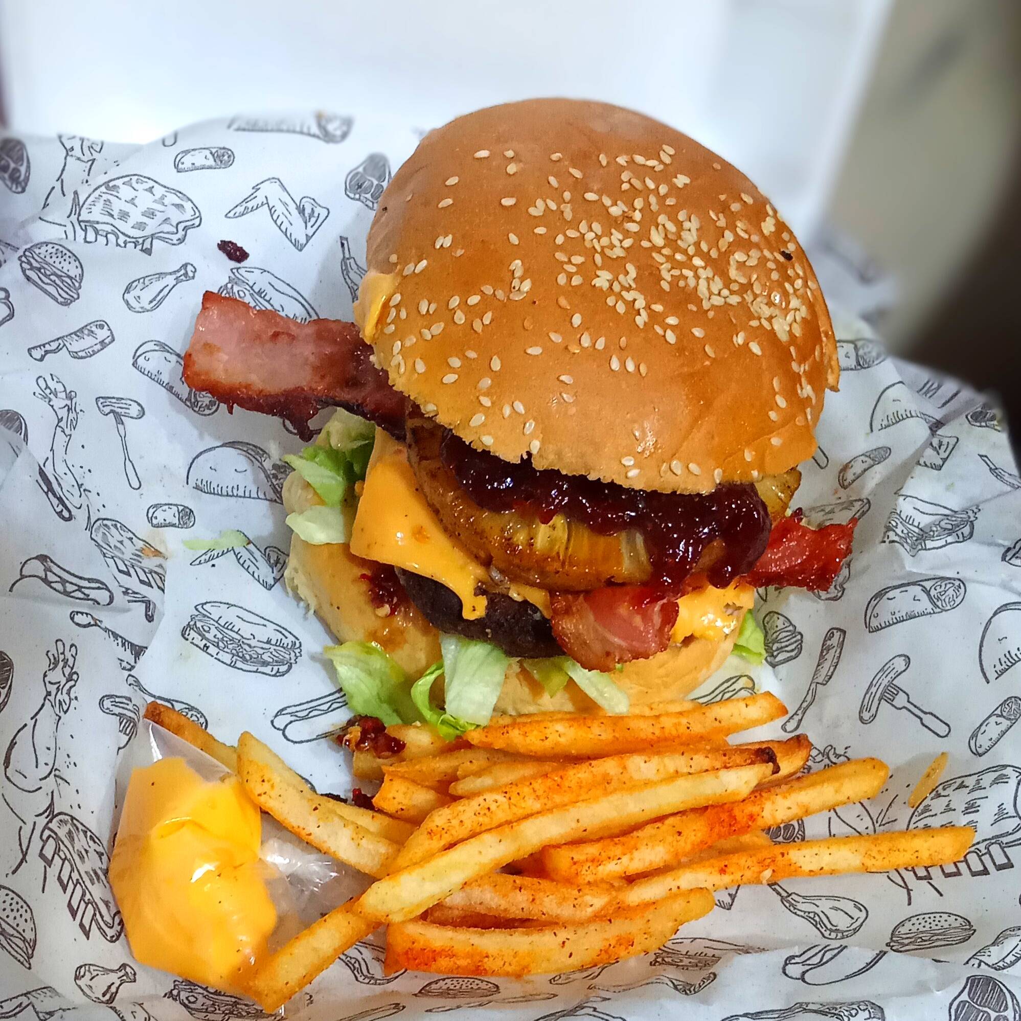 Mayonesa,Romanita,Carne,Queso,2 Tocinos,Piña,Mermelada,Cebolla Asada y Papas