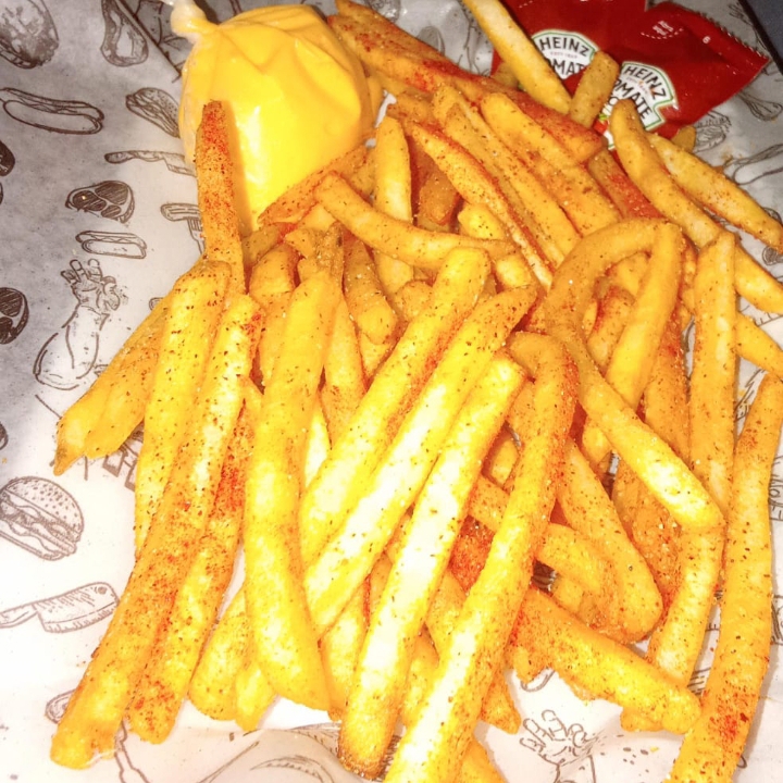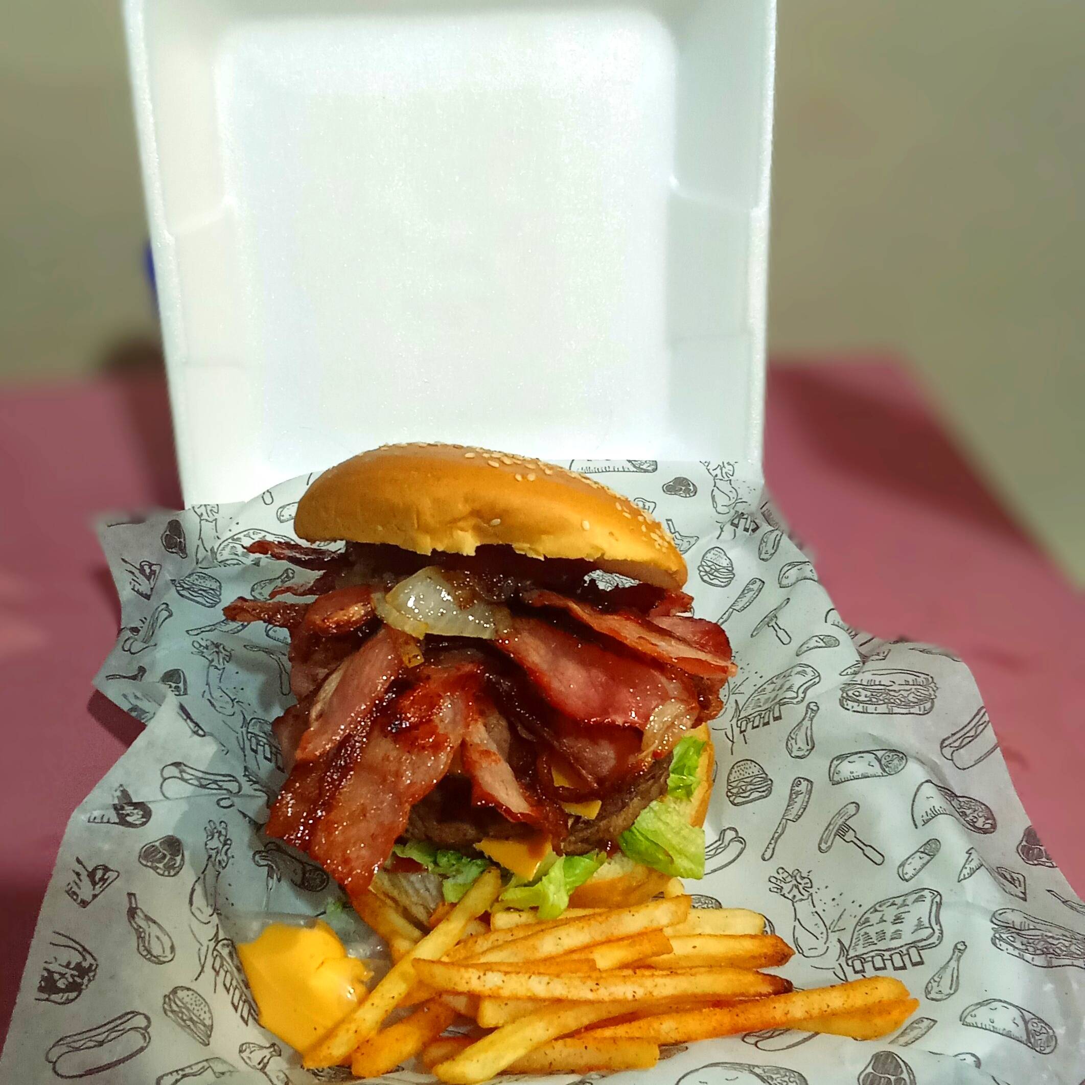 Mayonesa,Carne,2 Quesos,Tomate,Cebolla,Pepinillos,Ketchup y Papas