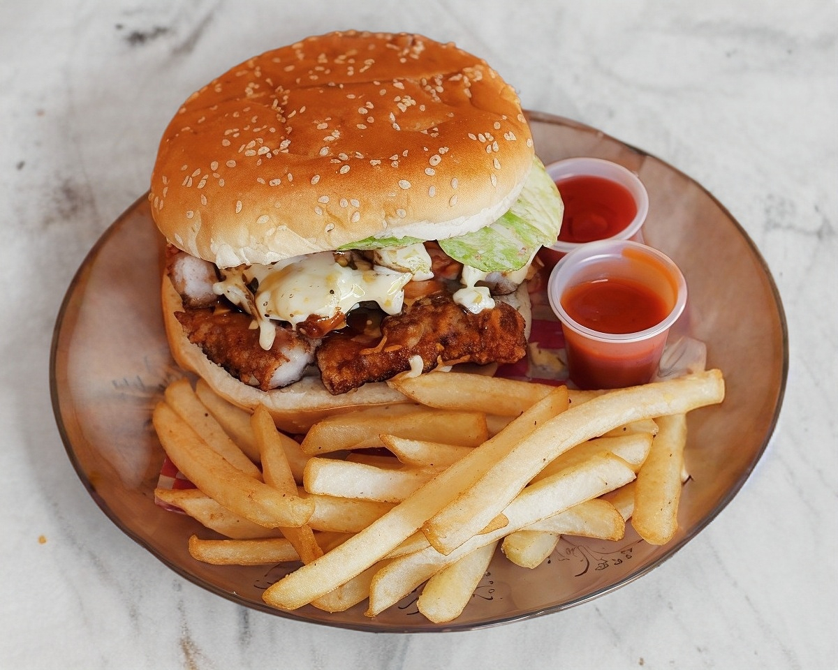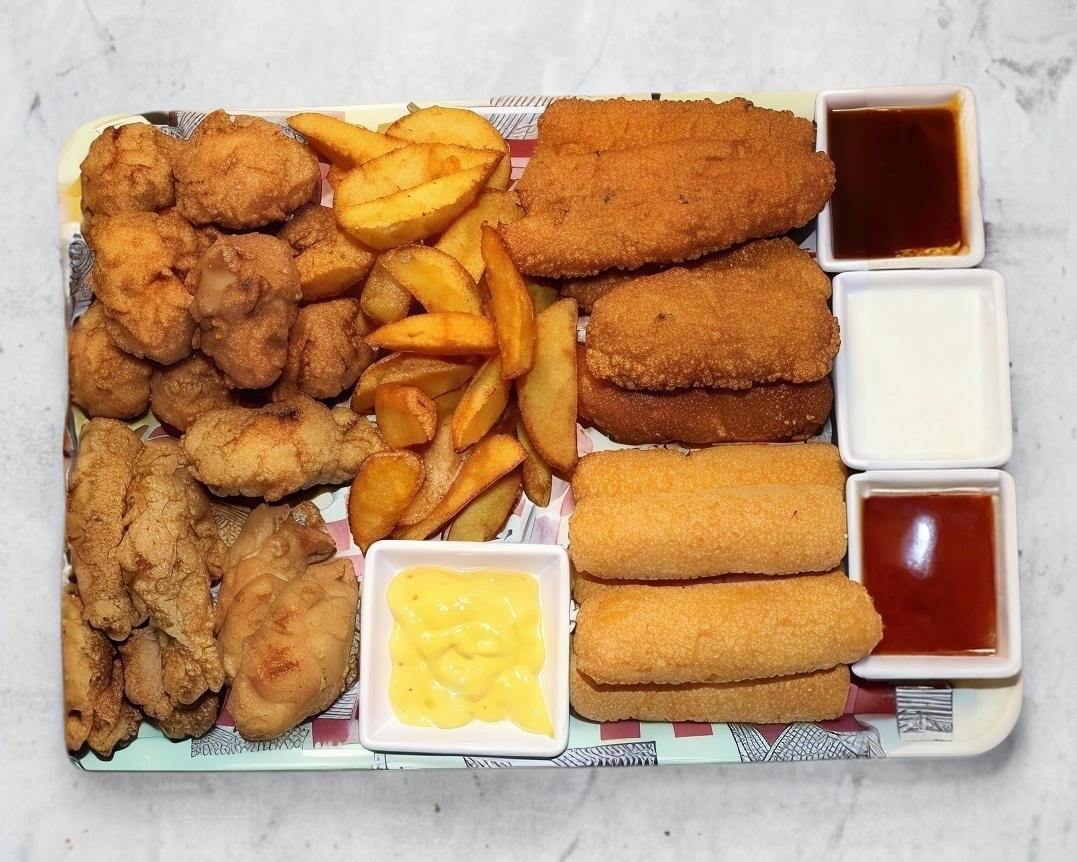 Tiras de pollo crispy queso lechuga tomate cebolla pepinillos acompañadas de papas a la francesa con Búfalo.