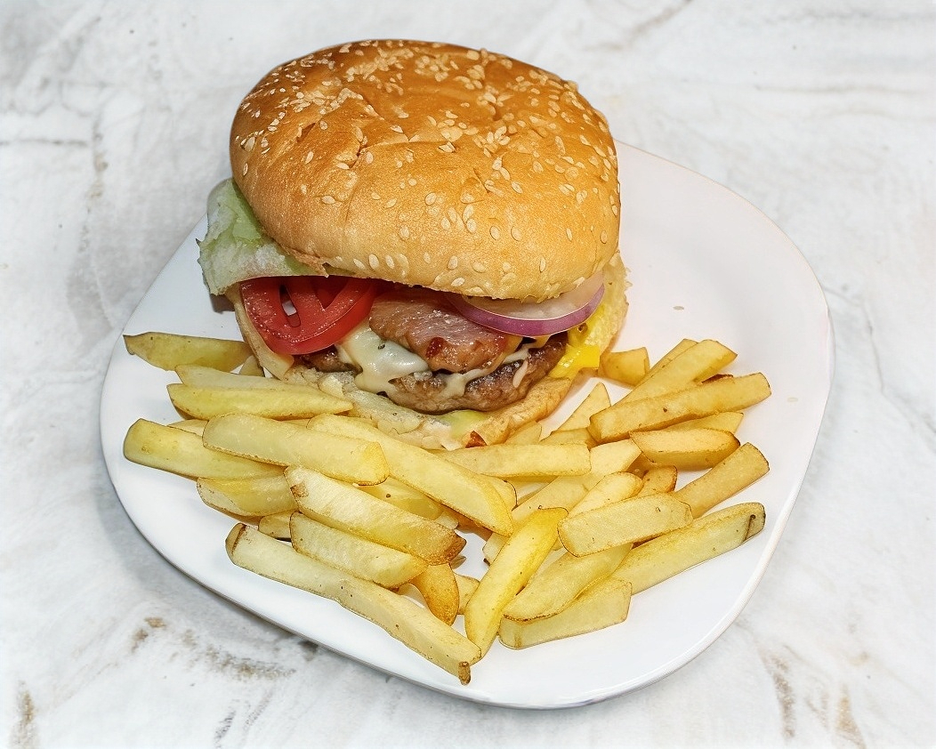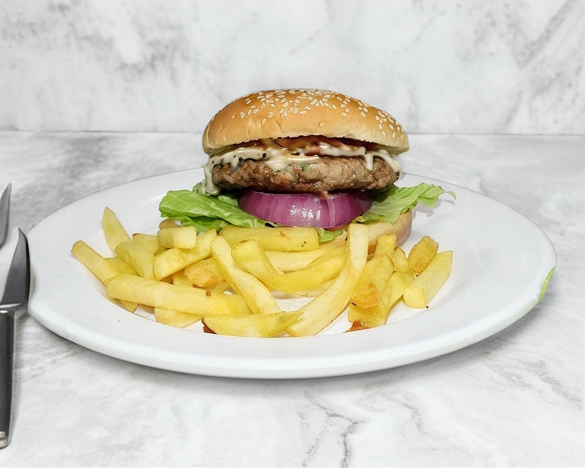 180 Gramos de deliciosa carne, champiñon, tomate. cebolla, pepinillos, queso, lechuga y papas a la francesa..