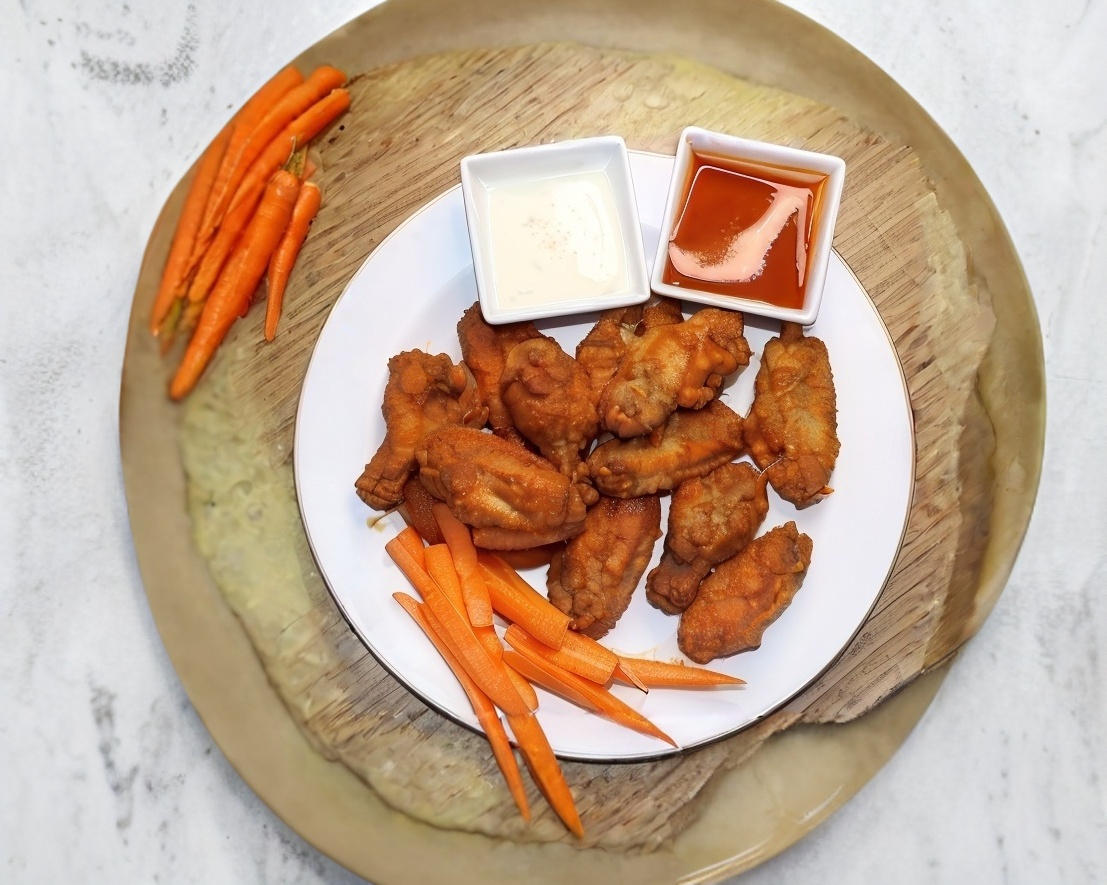 8 Piezas de alitas, mango habanero con aderezo ranch y zanahoria.