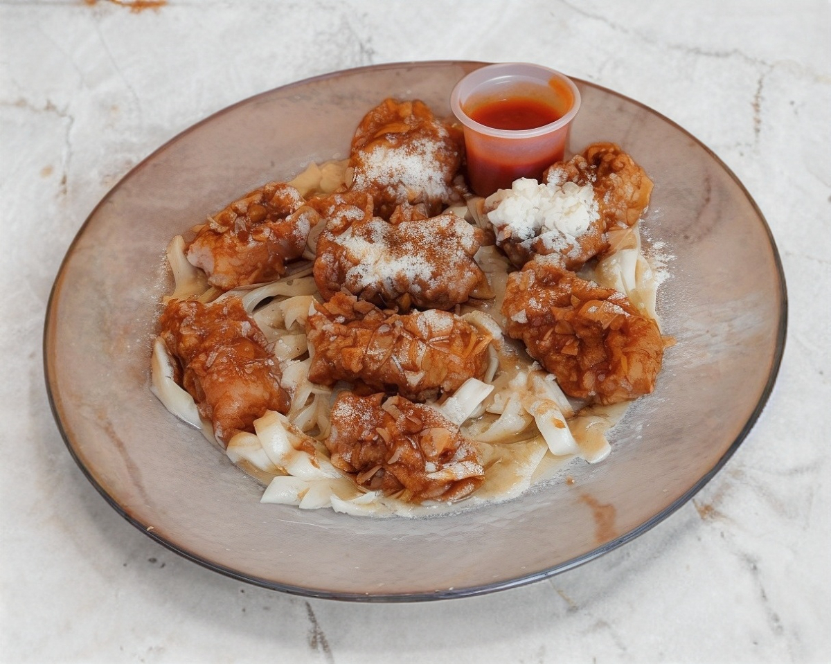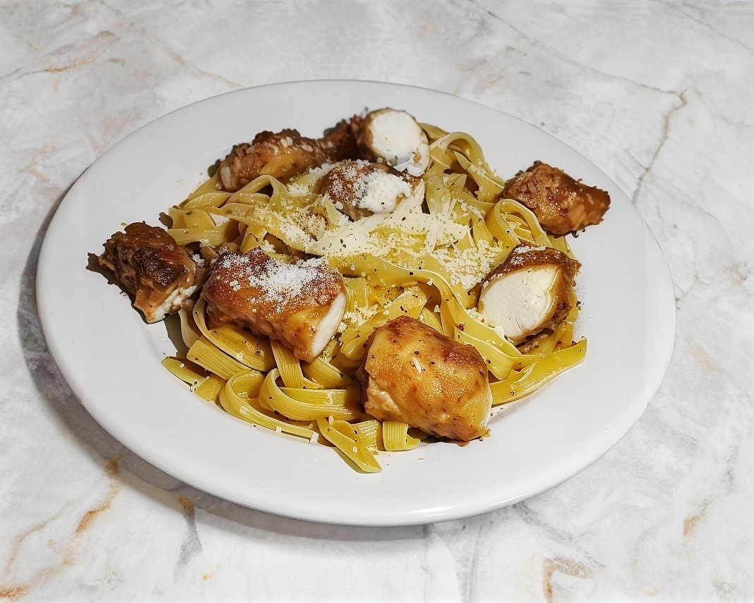 Pasta fettuccini con deliciosa salsa Alfredo con 8 cubos de pollo crispy, cubiertas de queso parmesano acidita.