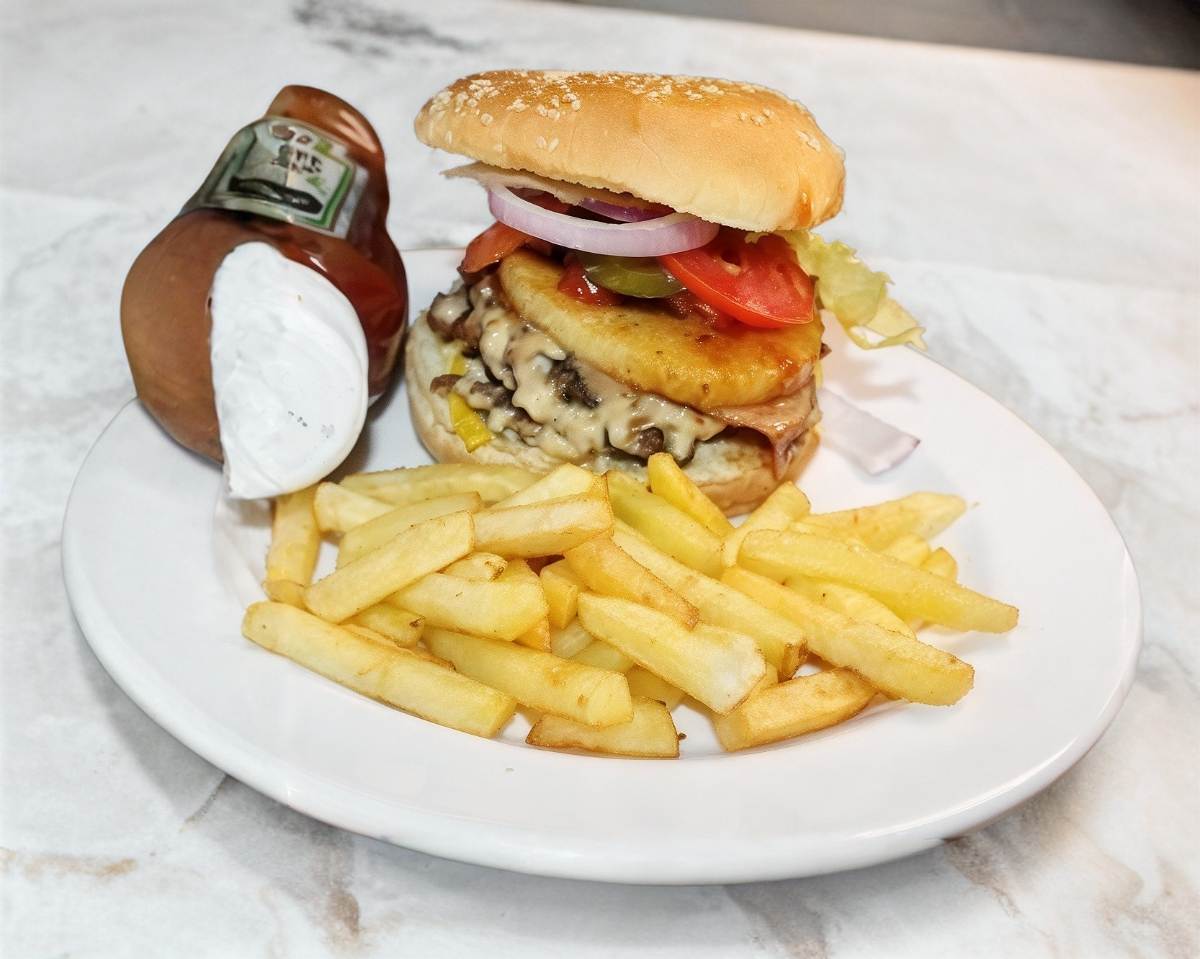 180 Gramos de deliciosa carne, piña, tomate, cebolla, pepinillos, queso, lechuga y papas a la francesa