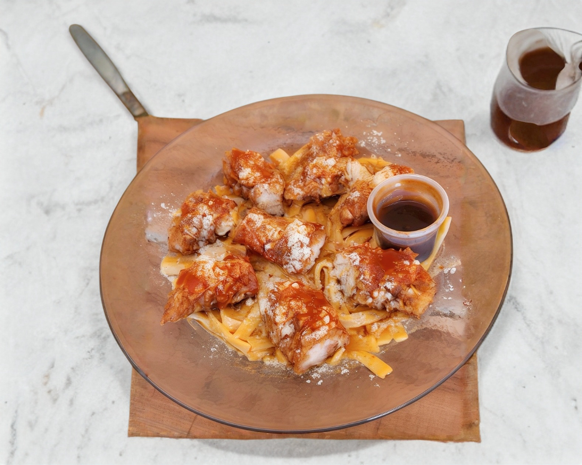 Pasta fettuccini con deliciosa salsa chipotle con 8 cubos de pollo crispy, cubiertas de queso parmesano picante.