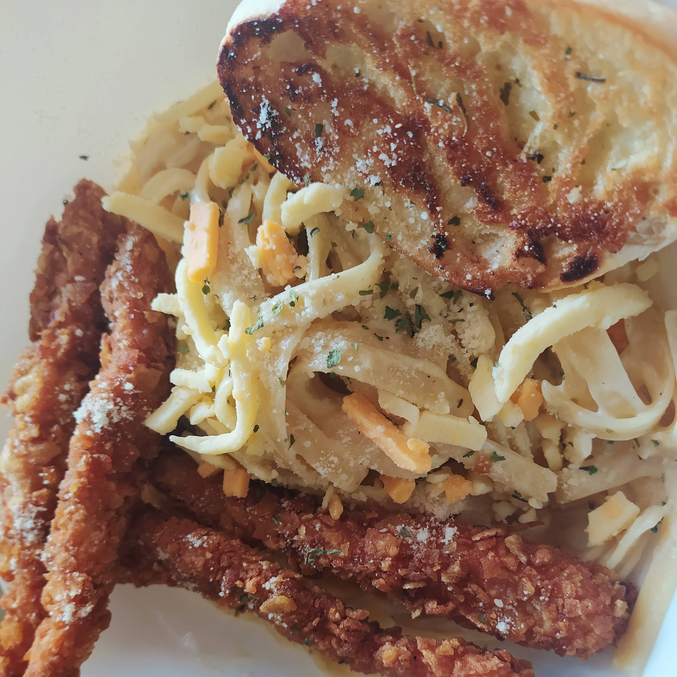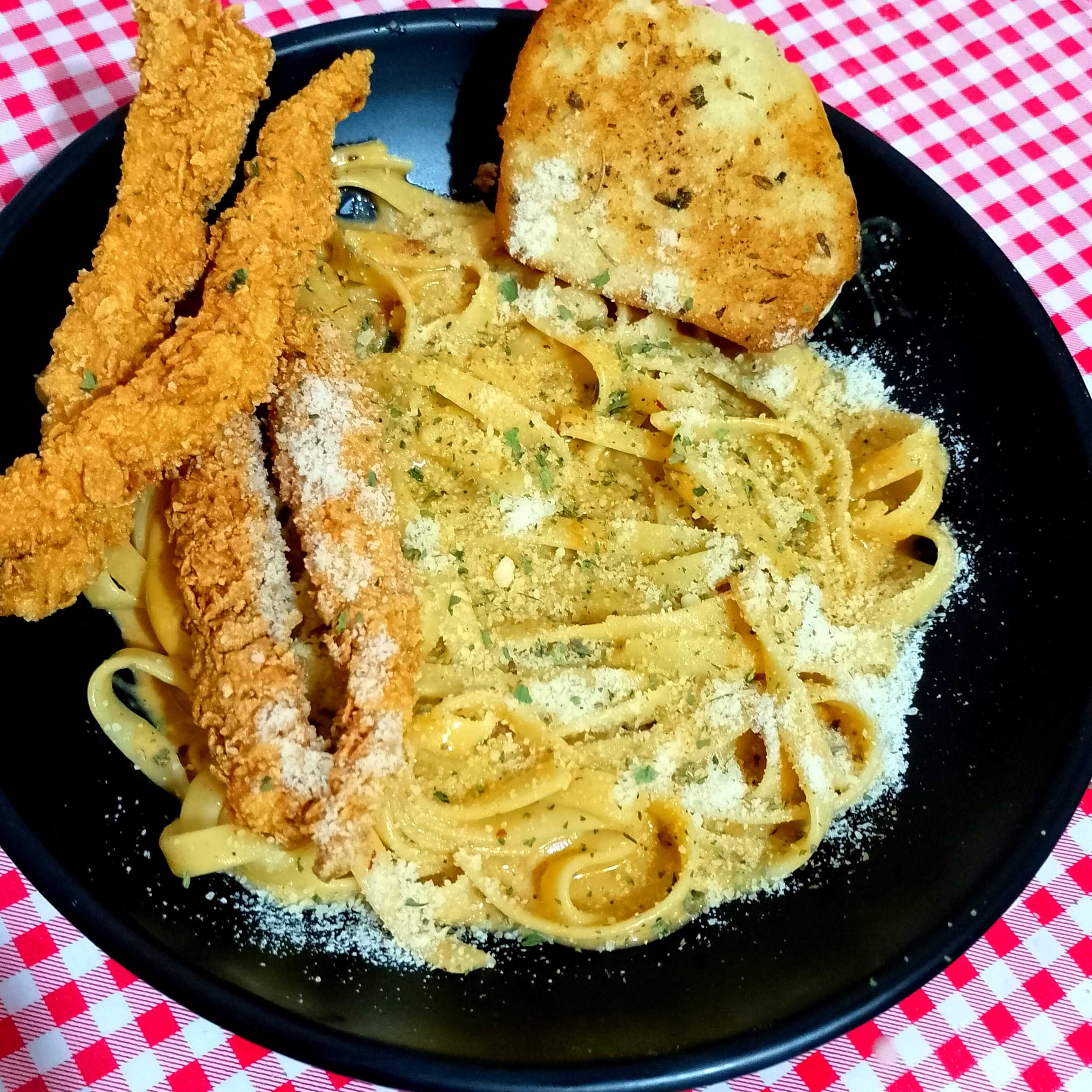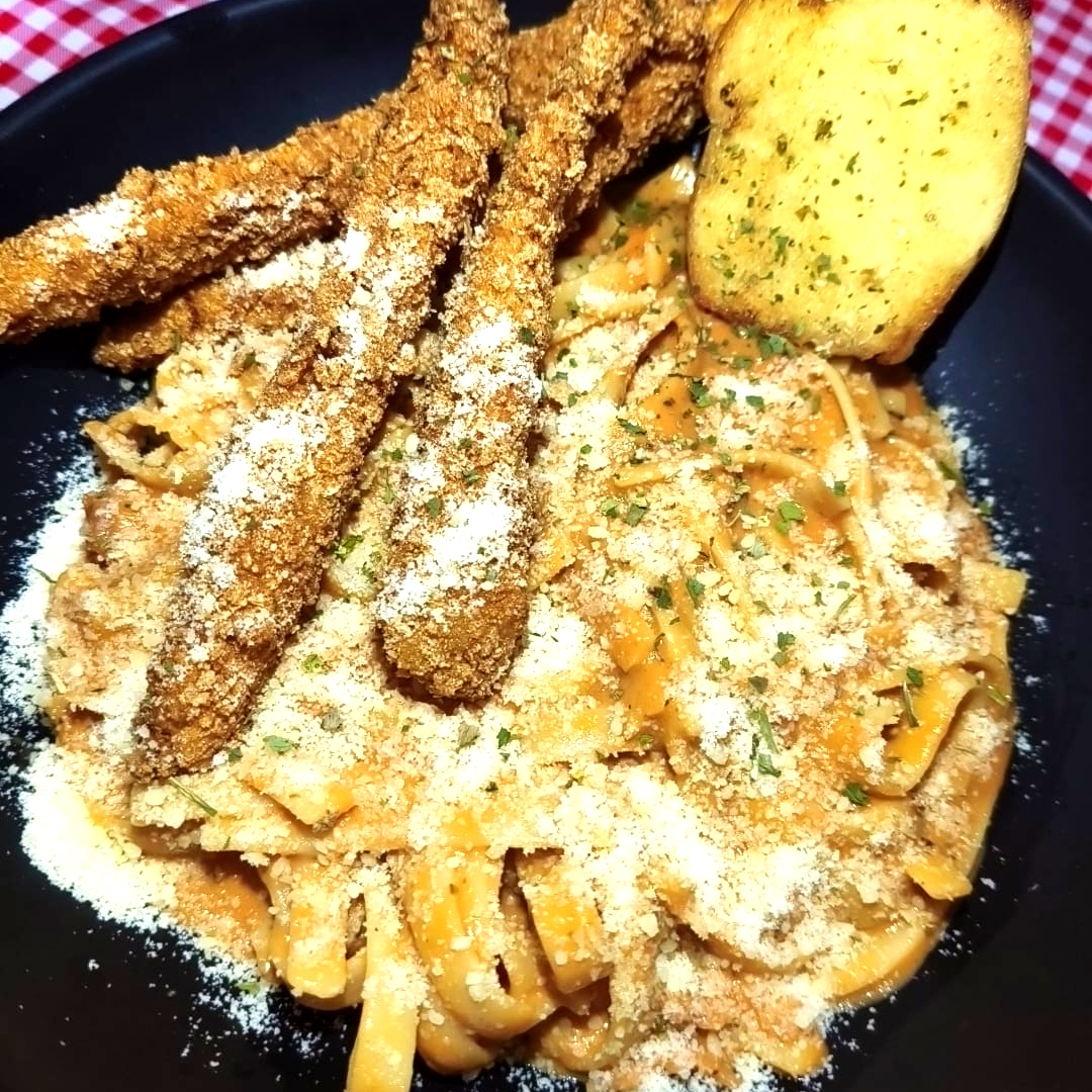 270g de pasta acompañado de 4tiras y un pan con ajo