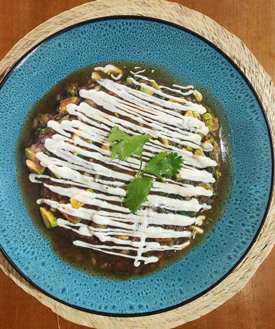 Tostadas de la casa sobre cama de frijol, bañadas con salsa de tu elección, servidas con crema, queso, cebolla y aguacate.